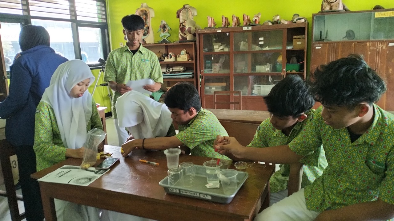 Bantul (MAN 1 Bantul) – Siswa kelas FD 2 MAN 1 Bantul melaksanakan praktikum biologi dengan materi osmosis dan difusi pada Rabu (20/8/25). Kegiatan ini dilakukan secara berkelompok dan dipandu oleh mahasiswa PK UNY, yaitu Pandu Dwi Nugroho dan Khaisy Alibrita.