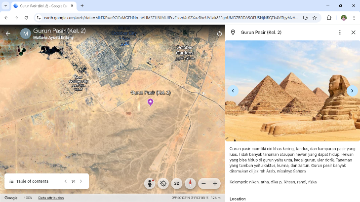 Dalam praktik pembelajaran, Rabu (24/9/2025) siswa diajak mengeksplorasi berbagai fenomena geosfer langsung melalui citra satelit, mulai dari bentang alam, karakteristik, dan berbagai jenis flora maupun fauna di lokasi yang telah di-marking. Siswa diberikan kebebasan untuk mengeksplorasi berbagai jenis bioma di permukaan bumi misalnya gurun pasir dan daerah bersalju. Hal ini diharapkan mampu meningkatkan kemampuan berpikir spasial sekaligus menumbuhkan rasa ingin tahu serta cinta terhadap lingkungan sekitar. Faiz, siswa kelas XI FD 3, mengungkapkan bahwa “saya memperoleh pengalaman baru, ternyata kita bisa membuat data di Google Earth versi kita sendiri. Kita bisa pakai platform ini untuk menyimpan perjalanan sewaktu piknik”.