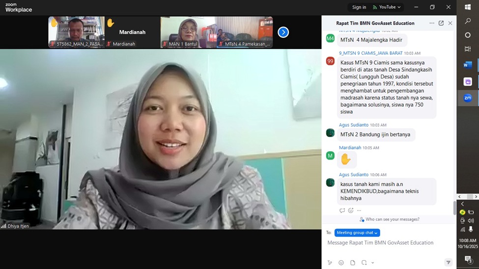 Bantul (MAN 1 Bantul) — Kepala Tata Usaha MAN 1 Bantul, Martiningsih, S.Pd.I., mengikuti kegiatan GovAsset Education yang diselenggarakan oleh Inspektorat Jenderal Kementerian Agama Republik Indonesia (Itjen Kemenag RI) secara daring melalui aplikasi Zoom Meeting, pada Kamis (16/10/2025).