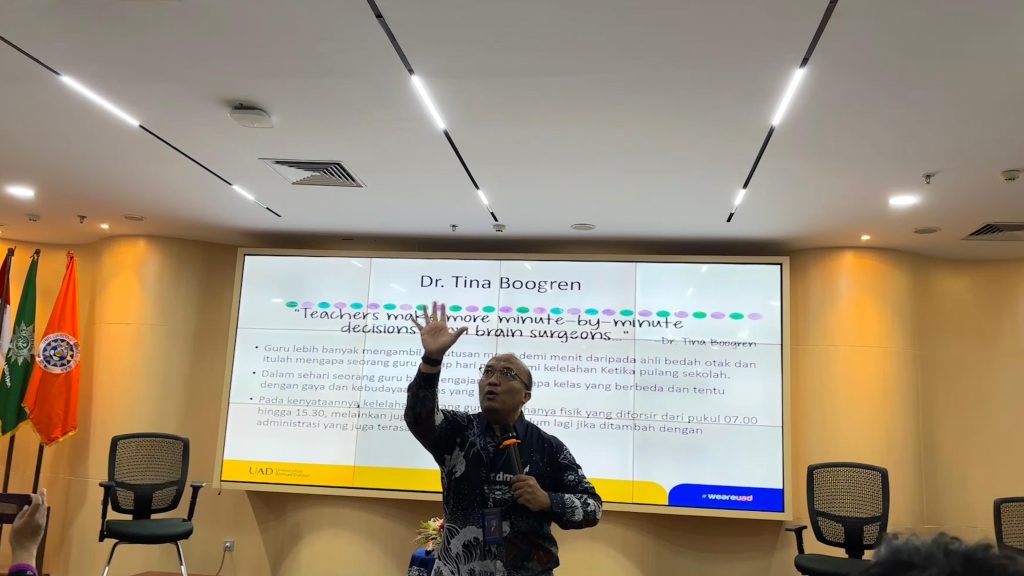 Beliau menegaskan bahwa “Guru yang bahagia akan mampu menciptakan siswa yang bahagia.” Dalam paparannya, Prof. Dodi juga menyoroti beratnya tanggung jawab guru, dengan mengutip pernyataan Dr. Tina Boogren, “Teachers make more minute-by-minute decisions than brain surgeons.” . Ungkapan ini juga menggambarkan betapa guru harus mengambil begitu banyak keputusan penting setiap menitnya, sehingga profesi guru menuntut fokus, ketenangan, dan kestabilan emosi yang tinggi.