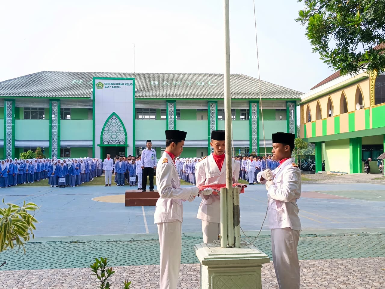 Bantul – Siswa kelas XI FD 5 MAN 1 Bantul melaksanakan tugas sebagai petugas upacara