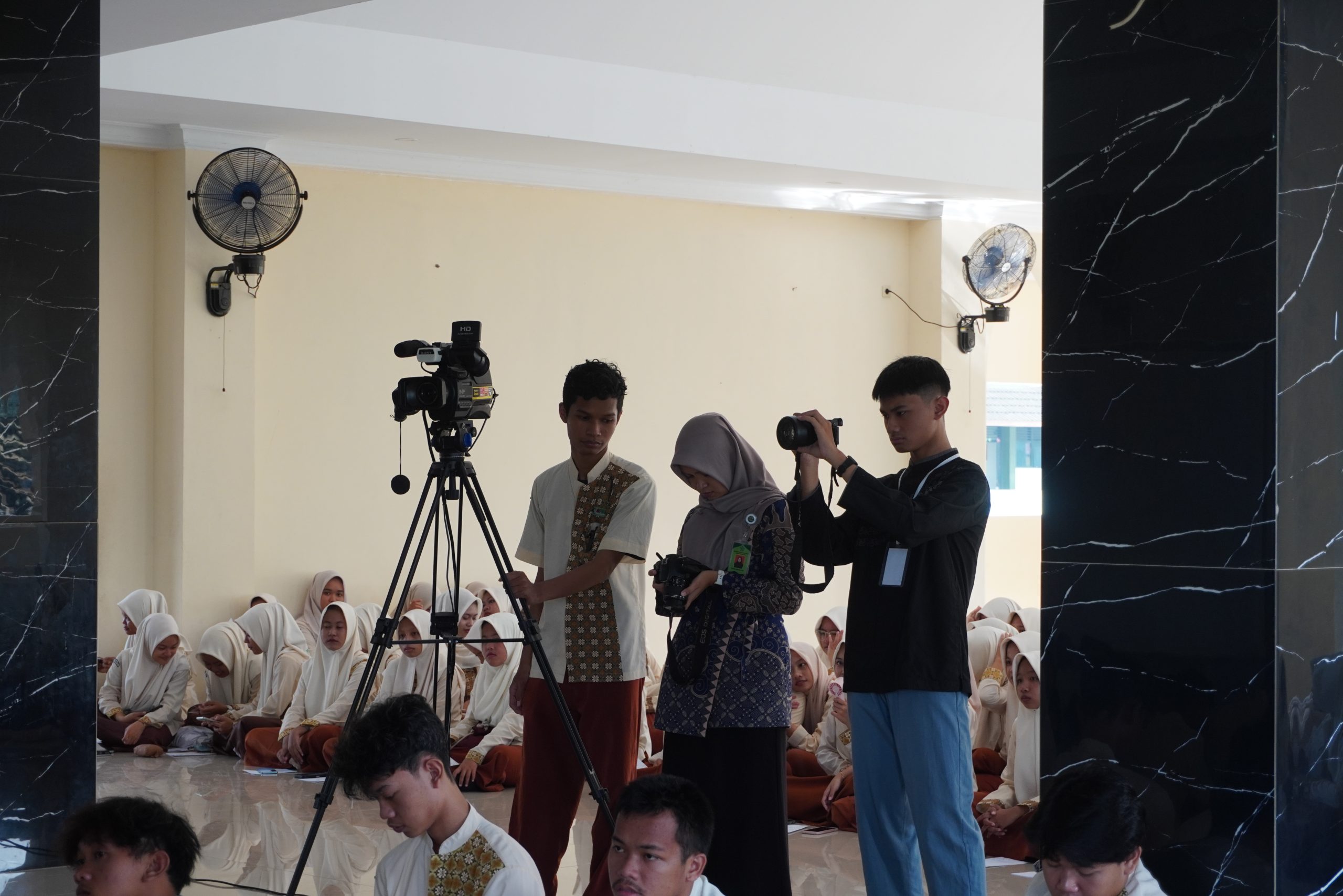 Tim gabungan ini membagi tugas secara sistematis. Beberapa siswa fokus pada pengambilan foto ekspresi peserta, sementara yang lain bersama guru multimedia mengelola dokumentasi video menggunakan tripod dan kamera profesional untuk memastikan hasil rekaman yang stabil dan berkualitas tinggi.