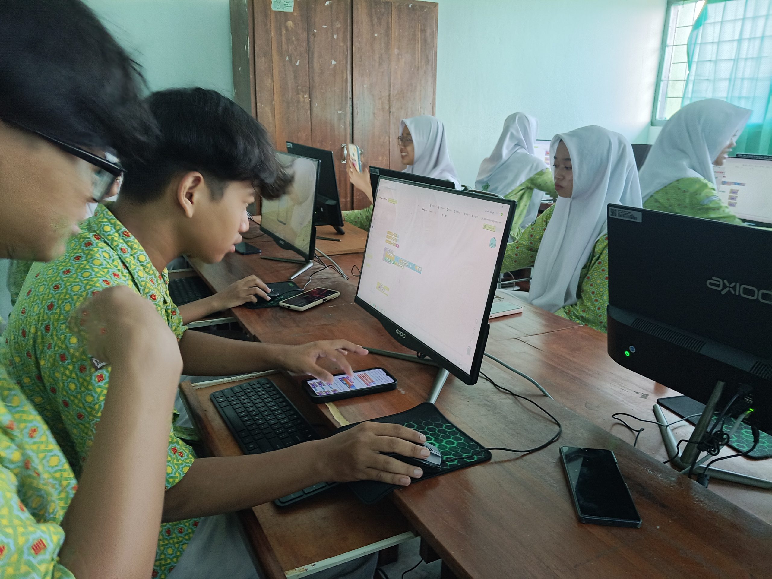 Antusiasme terlihat jelas saat para siswa mencoba menjalankan aplikasi hasil karya mereka sendiri. Proses menyusun kepingan blok kode Blockly menuntut ketelitian tinggi agar instruksi yang diberikan kepada sistem tidak mengalami error.​