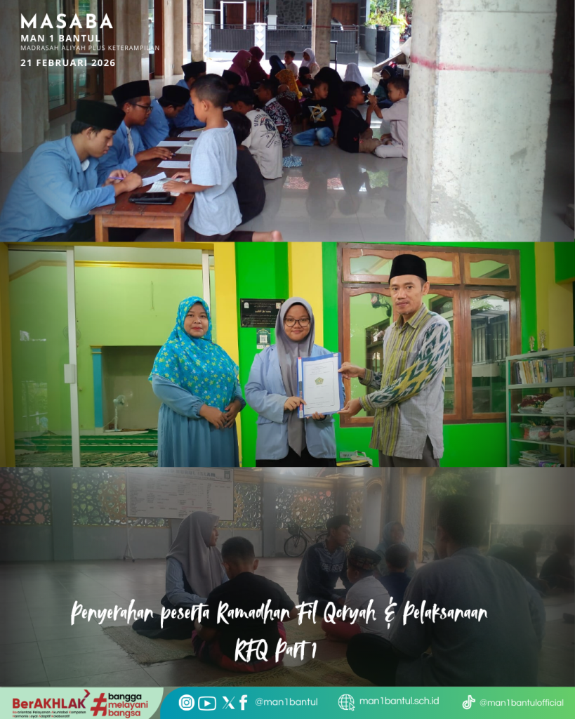 Bantul (MAN 1 Bantul) – Program Ramadan Fil Qoryah (RFQ) MAN 1 Bantul resmi dilaksanakan pada 20 Februari hingga 9 Maret 2026. Pada Sabtu (21/02/2026), madrasah melaksanakan penyerahan sekaligus pelepasan peserta sebagai bagian dari pelaksanaan kegiatan pengabdian siswa kepada masyarakat.