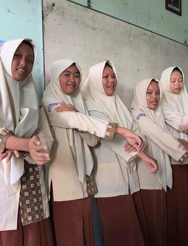 Para siswa kelas Fase E mengikuti setiap langkah dengan penuh perhatian. Mereka bergantian mempraktikkan gerakan sambil dipandu langsung oleh Zidda Mufida. Suasana belajar terasa hidup karena siswa tampak bersemangat, saling mengingatkan urutan langkah, serta sesekali tertawa ketika ada teman yang masih ragu dengan tahapannya.