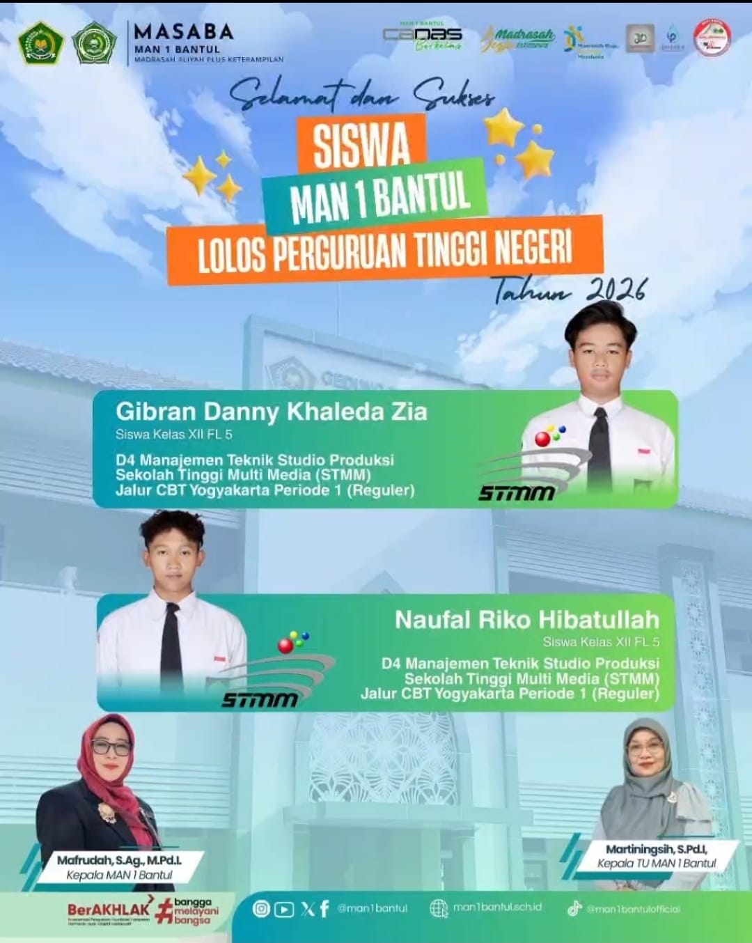 Bantul (MAN 1 Bantul) — Kabar membanggakan datang dari kelas XII FL 5 MAN 1 Bantul. Dua siswa terbaik, yaitu Gibran Danny Khakeda Zia dan Naufal Riko Hibatulloh berhasil lolos dan diterima di Sekolah Tinggi Multi Media (STMM) prodi D-4 Manajemen Teknik Studio Produksi, sebuah perguruan tinggi kedinasan yang berada di bawah Kementerian Komunikasi dan Informatika serta dikenal sebagai kampus unggulan di bidang teknologi komunikasi dan media digital.