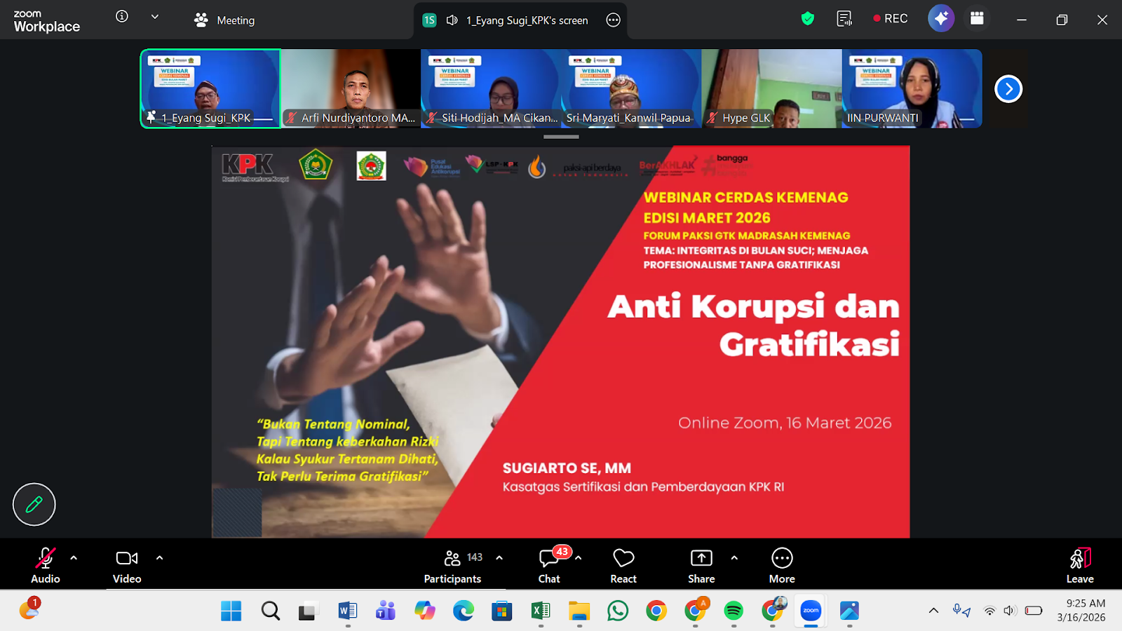 Webinar yang digelar pada Senin, 16 Maret 2026 ini menghadirkan deretan pemateri kompeten. Sugiarto, selaku Kasatgas Sertifikasi dan Pemberdayaan KPK RI, memaparkan pentingnya pemahaman gratifikasi dalam lingkup pendidikan dan strategi pencegahannya. Sementara itu, lin Purwanti, M.Pd. dari Itjen Kementerian Agama RI sekaligus Ketua FPAKSI GTK Madrasah, menekankan urgensi menjaga profesionalisme di tengah tuntutan integritas, terlebih di bulan suci Ramadan.
