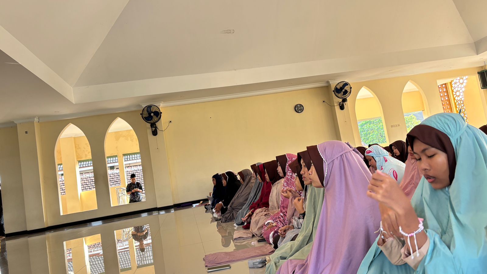Selain peserta yang melaksanakan salat, beberapa siswi yang berhalangan juga turut hadir dan berkumpul di serambi belakang masjid lantai 2 MAN 1 Bantul. Kehadiran mereka tetap menunjukkan semangat kebersamaan dan kedisiplinan dalam mengikuti kegiatan keagamaan. Hal ini mencerminkan sikap saling menghargai serta kebersamaan di antara siswa dalam menjalankan aktivitas madrasah.