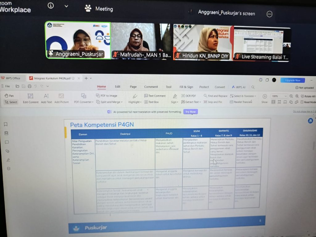 Bantul (MAN 1 Bantul) — Kepala MAN 1 Bantul, Mafrudah, S.Ag., M.Pd.I., mengikuti dengan antusias paparan materi Sosialisasi IKAN (Integrasi Kurikulum Anti Narkoba) yang diselenggarakan secara daring melalui Zoom Meeting. Kegiatan ini menjadi bagian penting dalam penguatan implementasi pendidikan karakter berbasis pencegahan narkoba di madrasah.