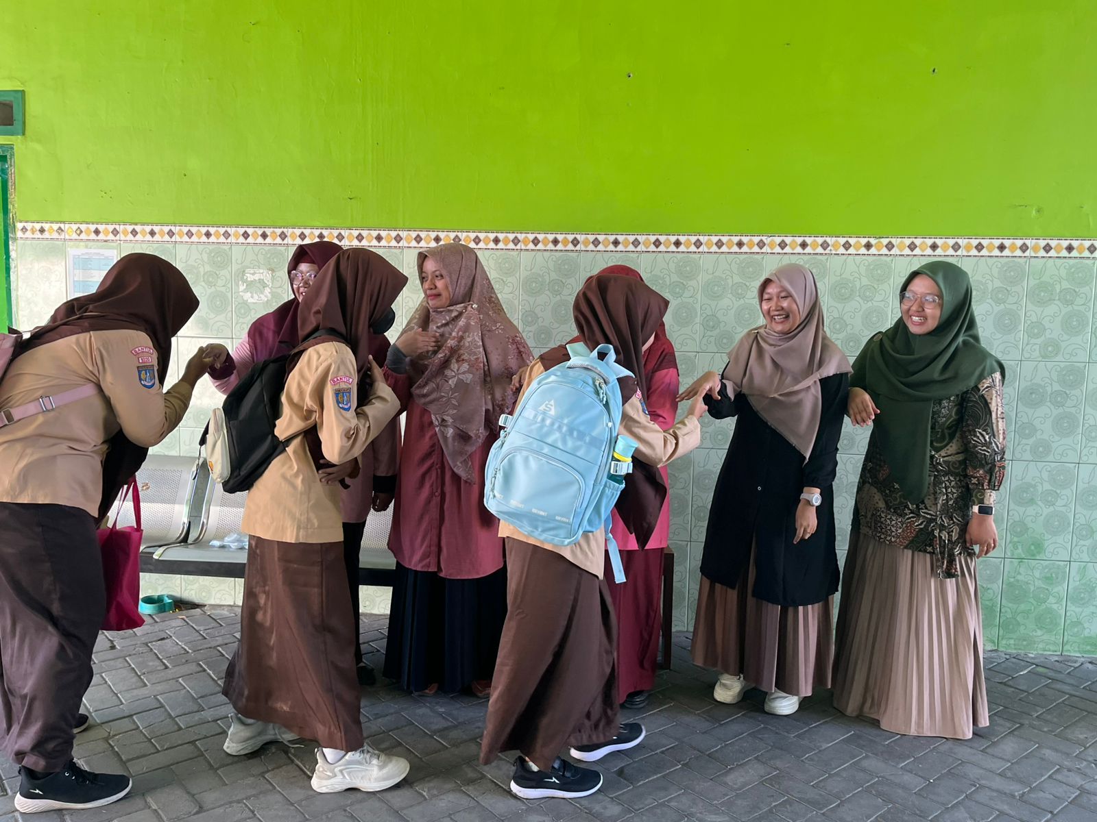 Para siswa tampak antusias dan bahagia saat memasuki area madrasah. Senyum yang terpancar dari wajah mereka mencerminkan kesiapan untuk mengikuti pembelajaran yang menyenangkan dan penuh cinta. Interaksi hangat antara guru dan siswa ini merupakan implementasi dari kurikulum berbasis cinta yang menekankan pentingnya hubungan positif, empati, dan suasana belajar yang nyaman.