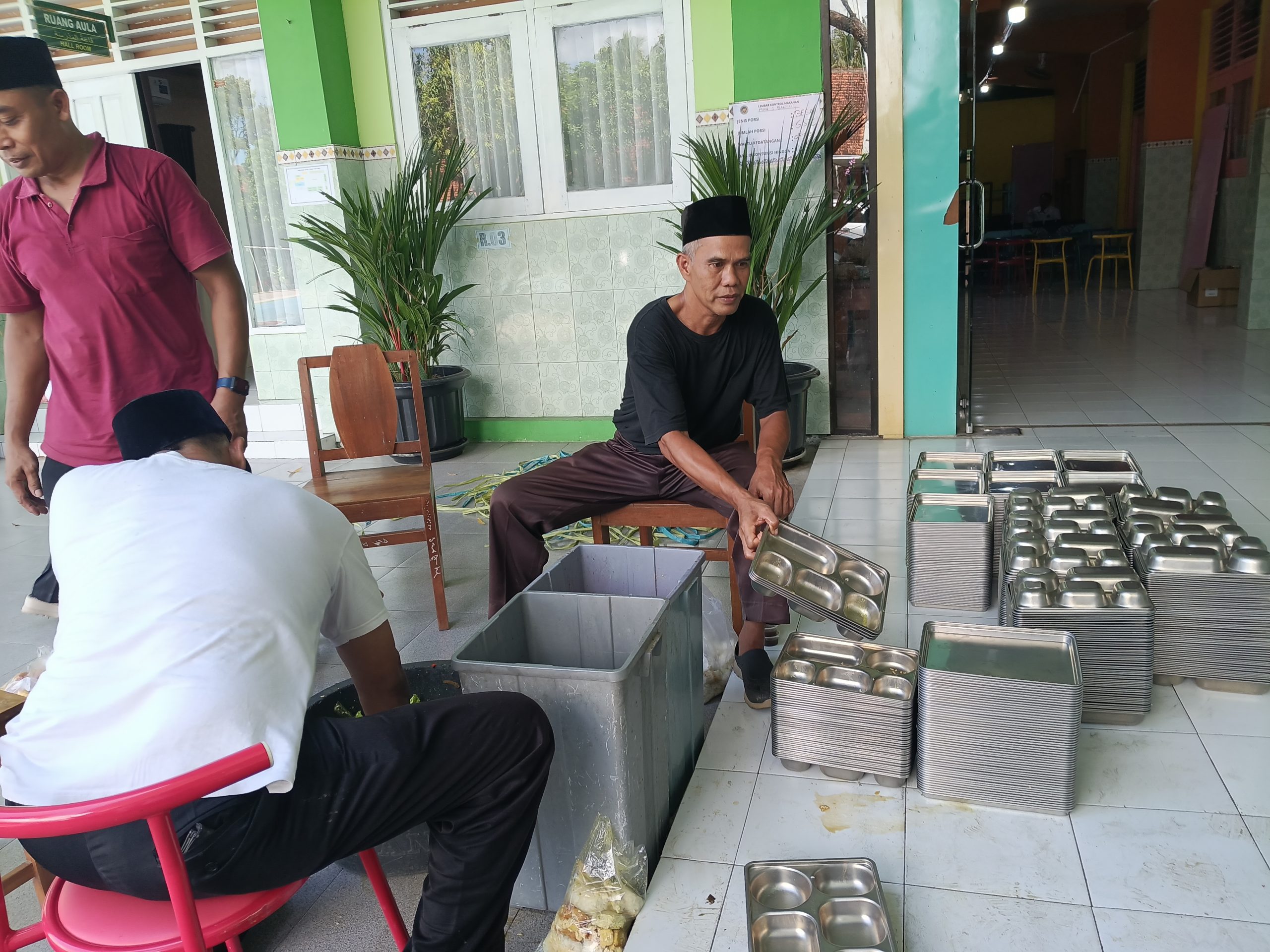 BANTUL (MAN 1 Bantul) — Komitmen dalam menjaga kelancaran program madrasah ditunjukkan oleh staf dan pegawai MAN 1 Bantul pada Senin (27/4/2026). Seusai pelaksanaan program Makan Bergizi Gratis (MBG), para pegawai tampak sigap membereskan dan menata kembali ratusan nampan stainless (ompreng) di area selasar gedung madrasah.