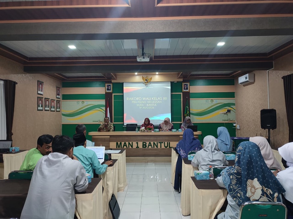 Bantul (MAN 1 Bantul) – Menjelang pelaksanaan pleno kelulusan Tahun Pelajaran 2025/2026, Wali Kelas XII MAN 1 Bantul menggelar rapat koordinasi guna membahas data dan kriteria kelulusan siswa. Kegiatan ini dilaksanakan di Aula MAN 1 Bantul pada Jumat (24/6/2026) dengan suasana penuh keseriusan dan tanggung jawab, sejalan dengan semangat madrasah dalam mewujudkan tagline Cadas Berkelas.